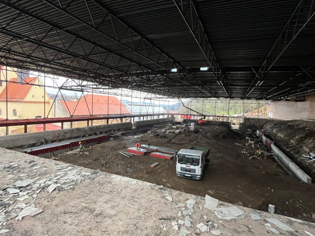 „Uvnitř jsme začali provádět práce na ledové ploše, což znamená provádění betonáže obrub, energo kanálu pro topení a chlazení ledové plochy. Započali jsme práce na střešním plášti, čili pokládka trapézových plechů a skladba tepelné izolace a pokládka asfaltových pásů.“